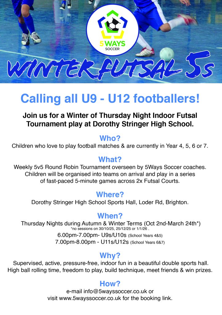 What?: A weekly Round Robin Futsal Tournament overseen by 5Ways Soccer coaches taking place every Thursday through the Autumn and Winter Term.